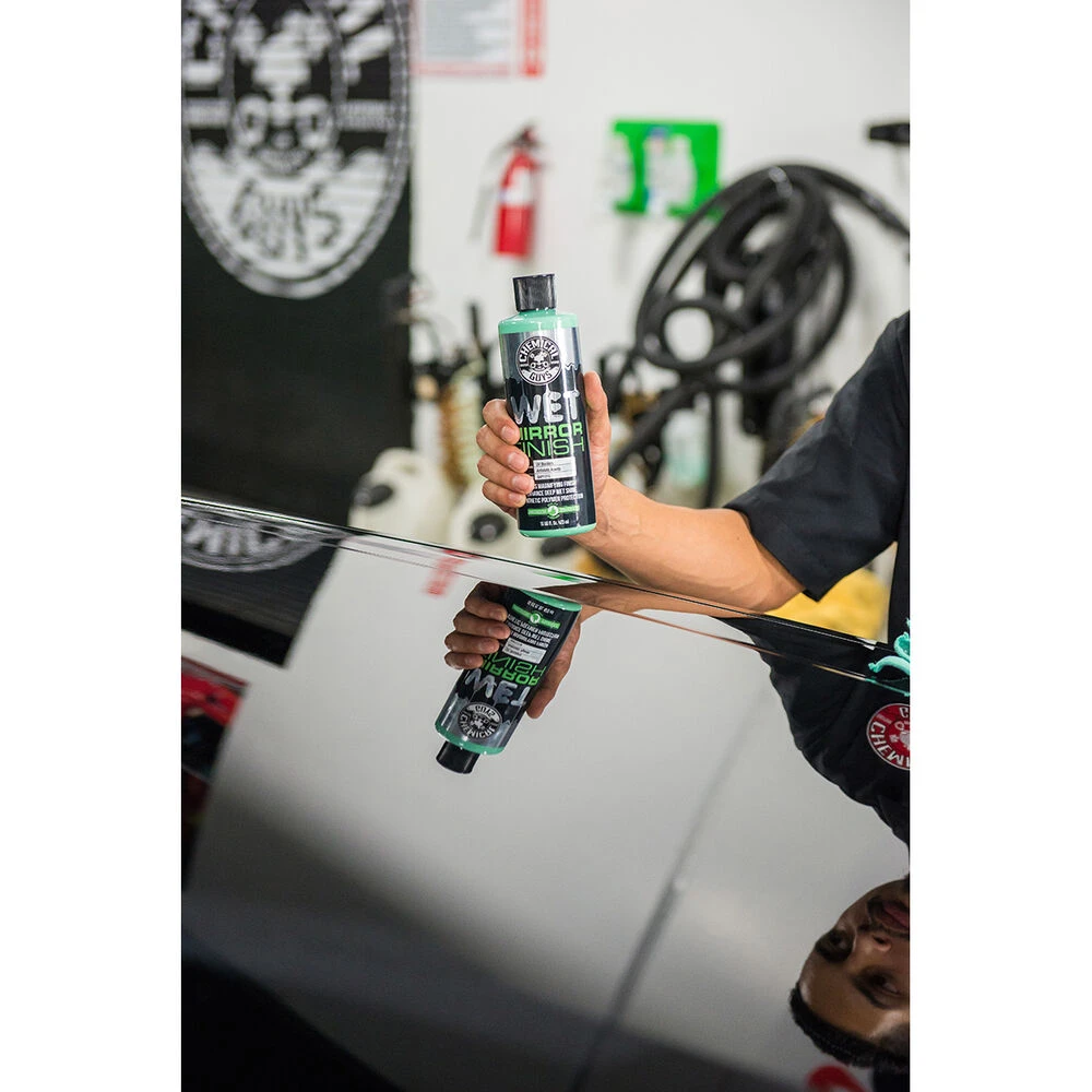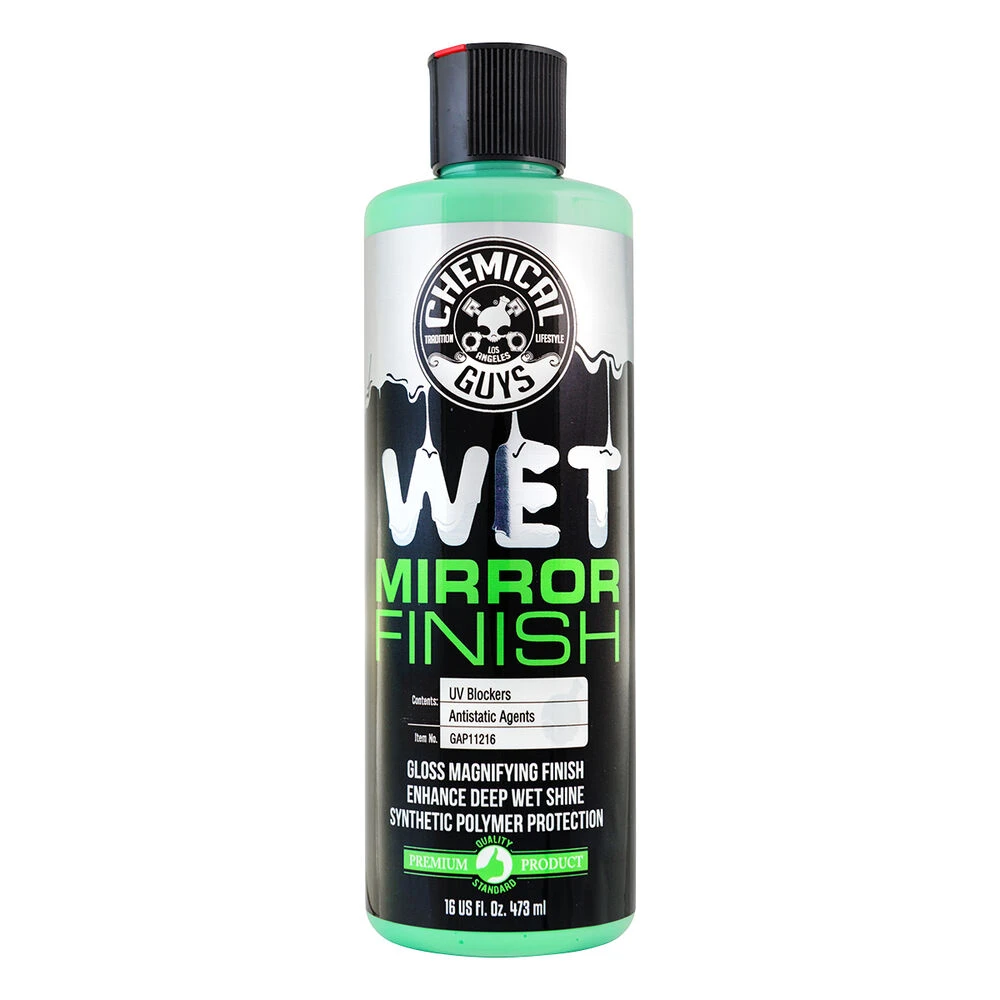 For amazing shine at the nano-tech level, the synthetic formula of Chemical Guys Wet Mirror Finish bonds to painted surfaces for a truly slick finish. This advanced, penetrating formula goes deep into light swirls and scratches in paint, creating an flat surface that evenly reflects light for an extra-wet shine. Wet Mirror Finish cleanses paintwork, fills minor swirls and scratches, and bonds to the surface to enhance the colour and add extra lustrous shine.