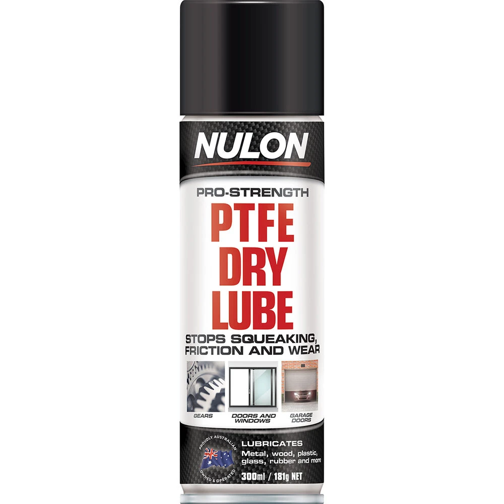Nulon Pro-Strength PTFE Dry Lube is a multipurpose lubricant containing PTFE (Polytetrafluoroethylene) for increased protection and lubricity. It is suitable to use on most surfaces inlcuding metal, plastic, glass, wood and rubber leaving a dry coating without an oily residue. Ideal for use around the home and workshop it can be used for most general purpose applications such as doors, locks, tracks, chains, bearings, glass doors and more.