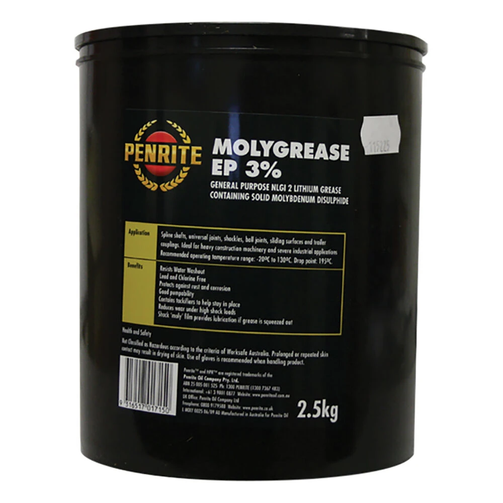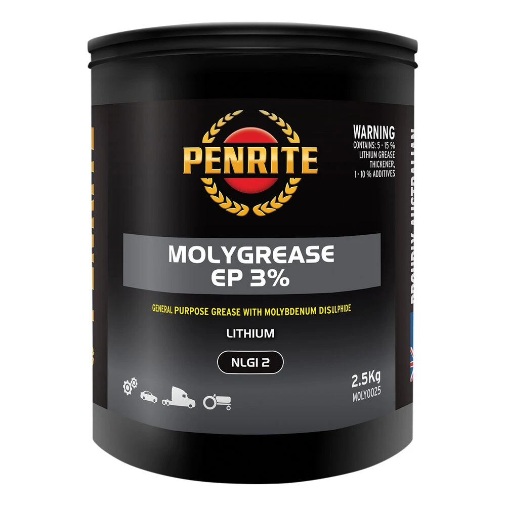 Penrite Moly EP 3% is an all purpose, NLGI 2, high temperature grease. It features a lithium soap base with premium quality base oils and 3% molybdenum disulphide (moly) for added extreme pressure protection.