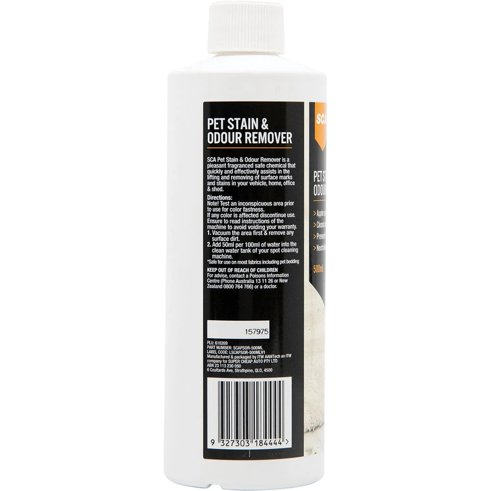 SCA Pet Stain & Odour Remover is a pleasant fragranced safe chemical that quickly and effectively assists in the lifting and removing of surface marks and stains in your vehicle, home, office & shed.