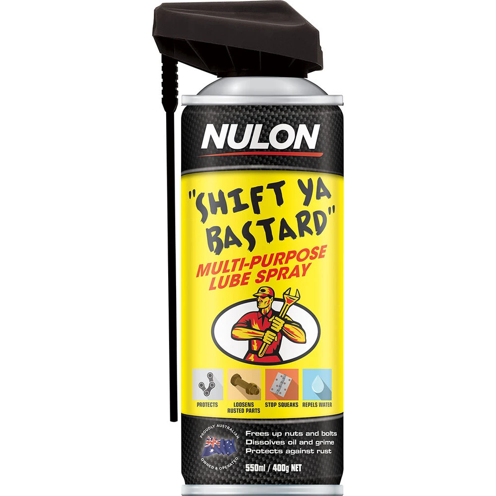 Nulon Shift Ya Bastard is a premium multipurpose spray lubricant that has a multitude of uses around the home, garage or workshop. Nulon Shift Ya Bastard Penetrates and lubricates fast to loosen rusted and seized fasteners, tools, hinges, wheels and castors while providing long lasting protection and quiet, smooth operation. Shift Ya Bastard also dispersers water, great for use in water contaminated distributor caps and spark plug leads while corrosion inhibitors prevent corrosion and rust on all metal surfaces. Shift Ya Bastard can even be used to clean road tar and bugs from paintwork and can even dissolve and remove grease, oil, adhesive and permanent ink from surfaces. Stop that annoying squeak, sticking drawer and remove those hard to shift grease marks with Nulon Shift Ya Bastard.